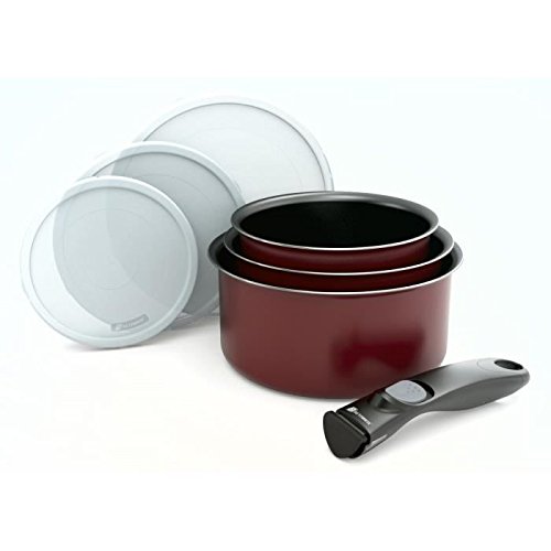 PRODUCT DESCRIPTIONS:Colour: Red Aluminium Cook set 7 pieces including: 3 saucepans (16/18/20 cm sizes) + 3 hermetic lids made of metal + 1 removable handle. Coating Inner: anthi-adhésif. Dotted non-stick coating free from PFOA (perfluorooctanoic acid). Suitable for all heat sources, including induction. Suitable for use in a traditional oven and dishwasher safe.