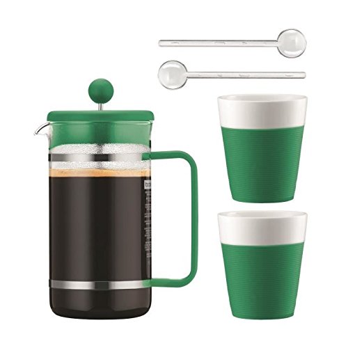 Buy Online Bodum Bistro Set Green Cafetiere Plunger 1l + 2 Cups Porcelain 30 ml Silicone Band and 2 Spoons Stirrer - Best Offer Product To Buy Online Right Now